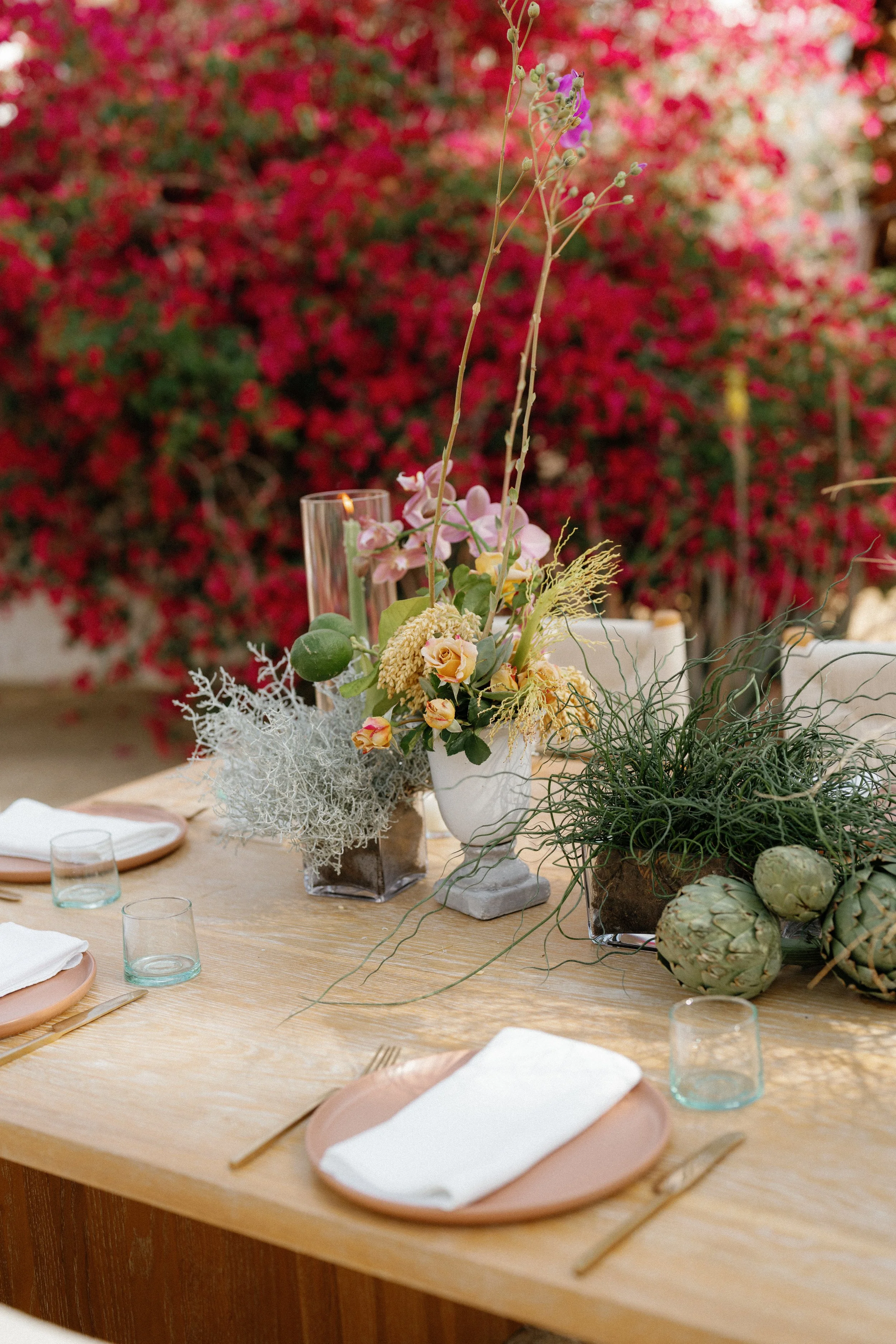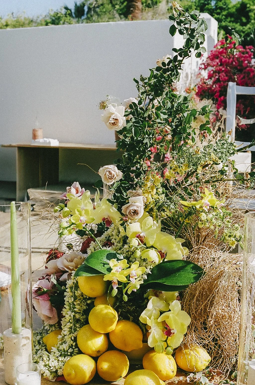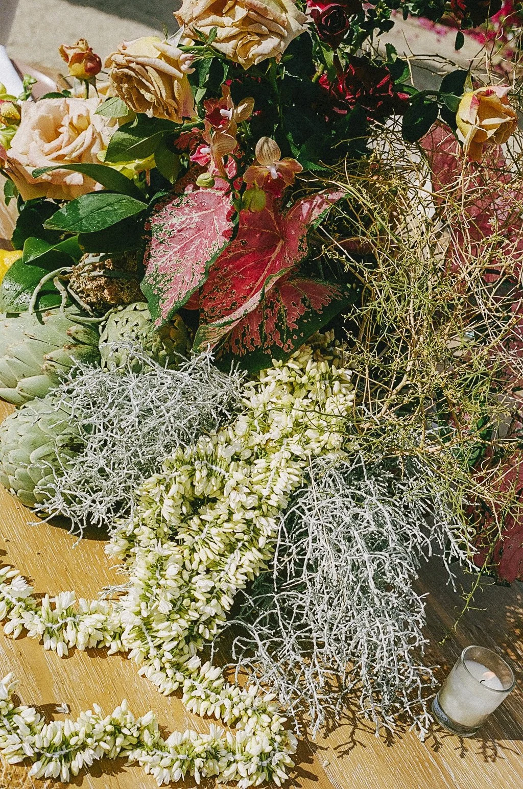 locally sourced garden roses, pincushions, artichokes, lemons, and desert plants