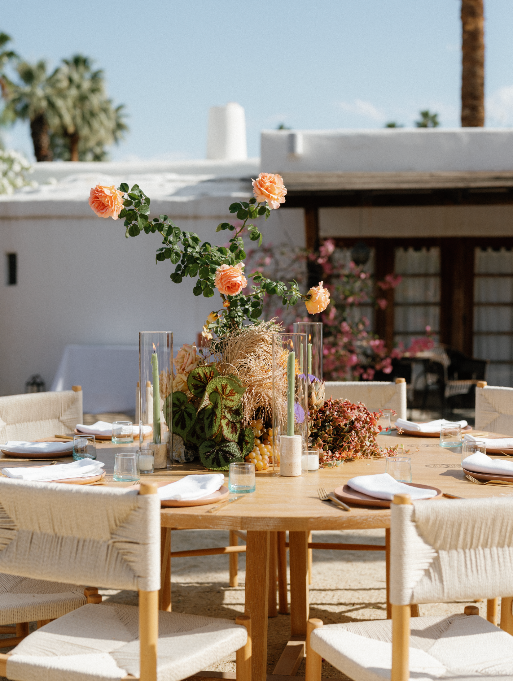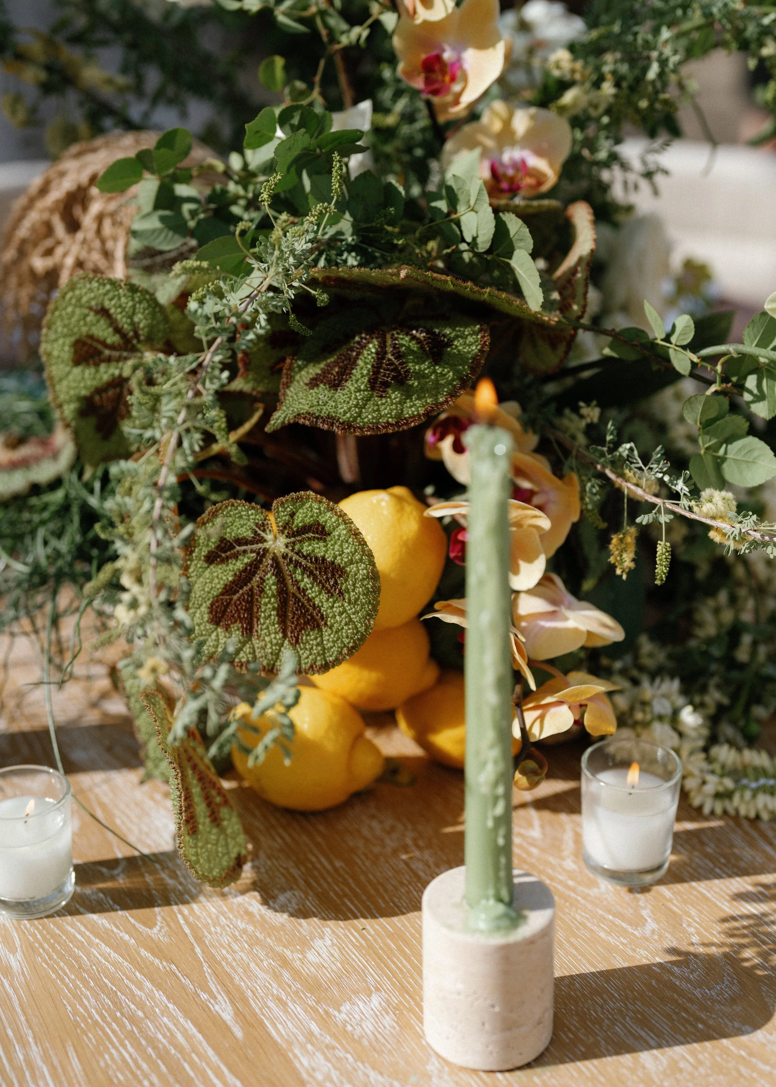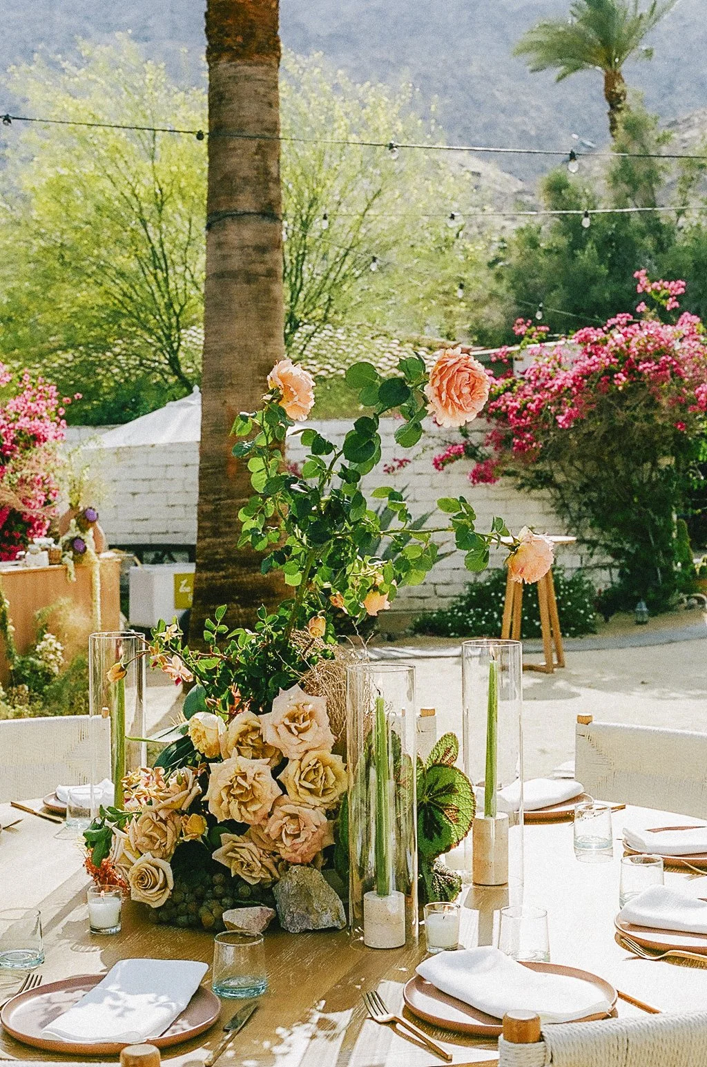 locally sourced garden roses, pincushions, artichokes, lemons, and desert plants
