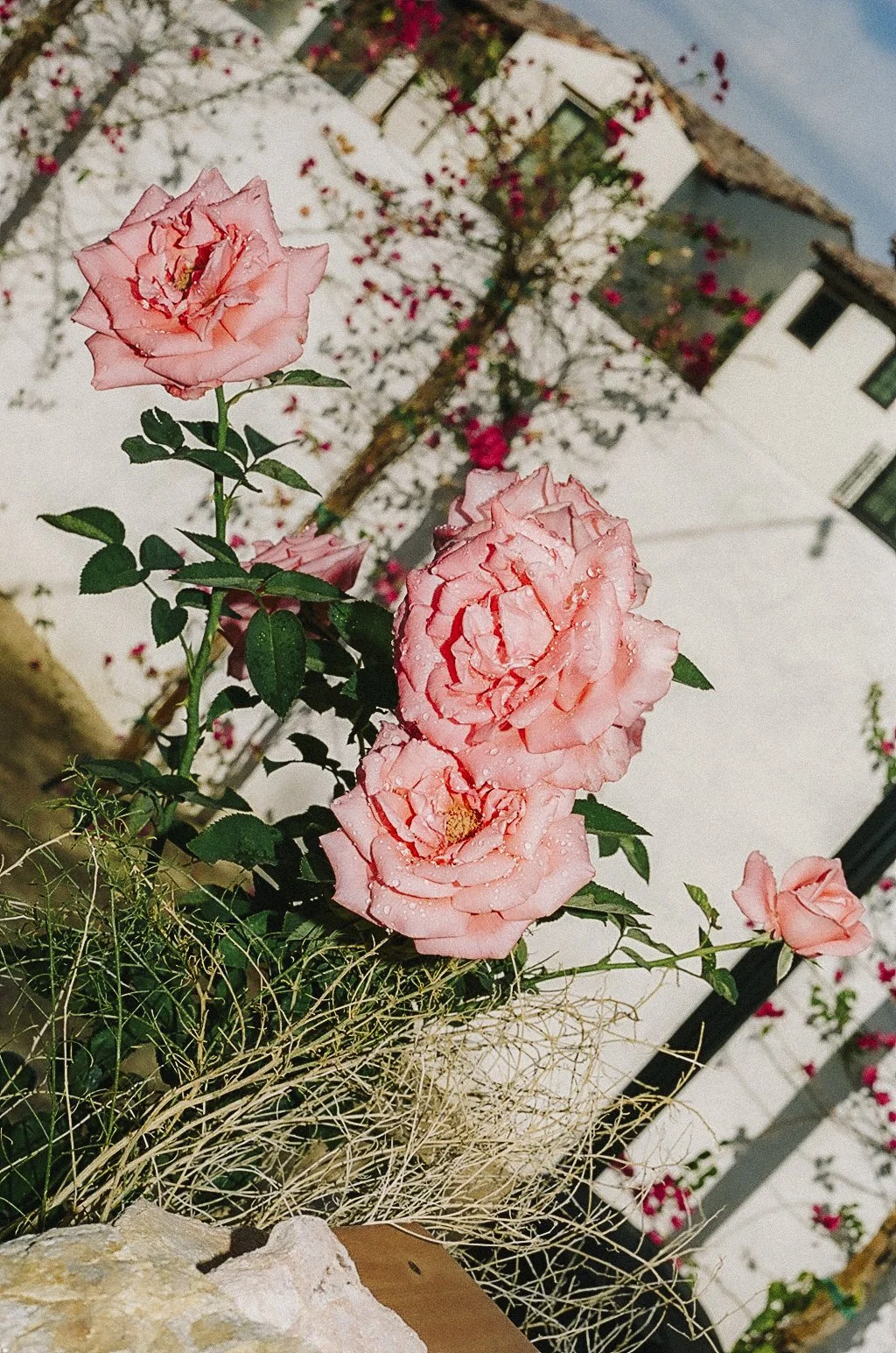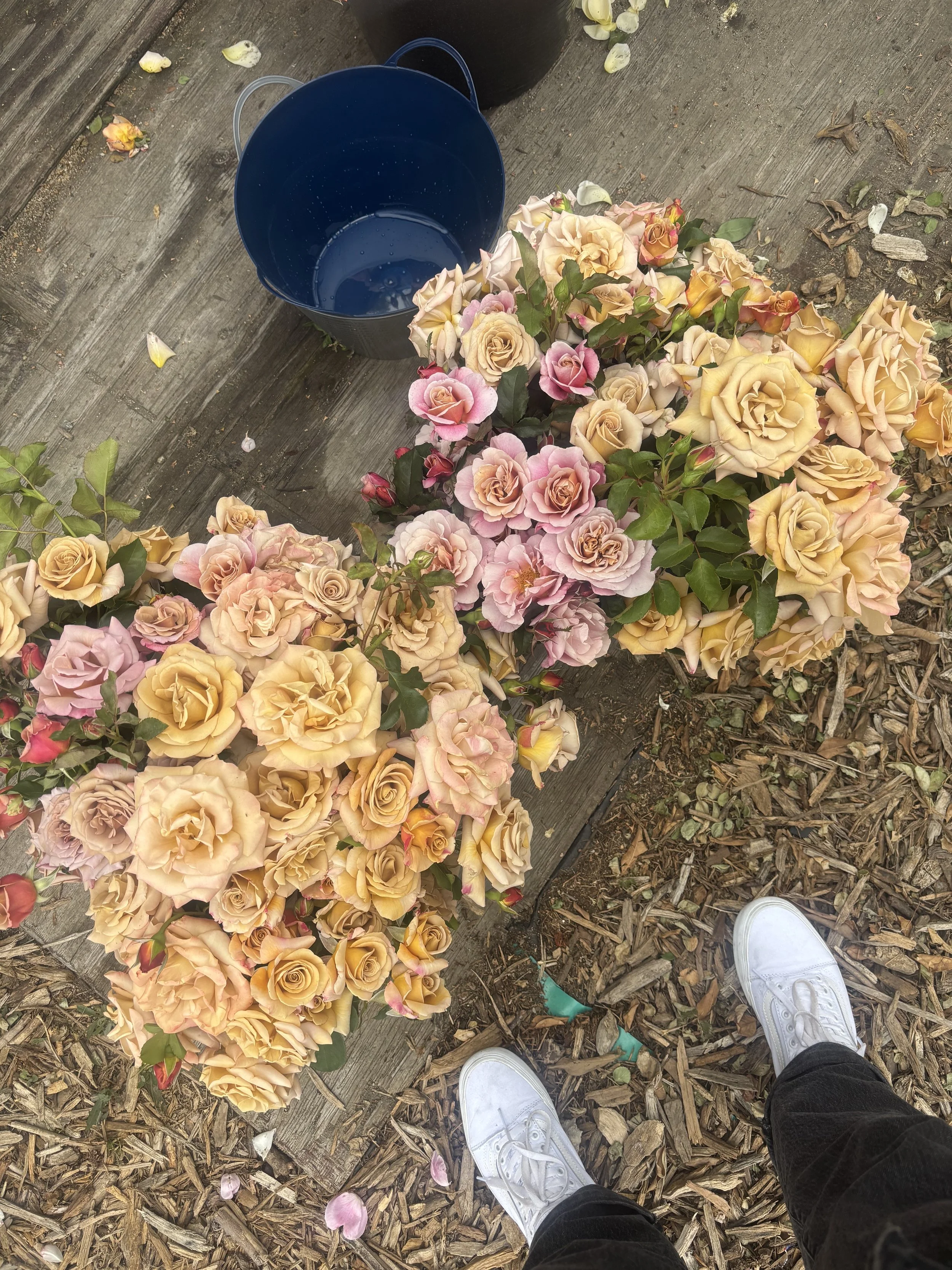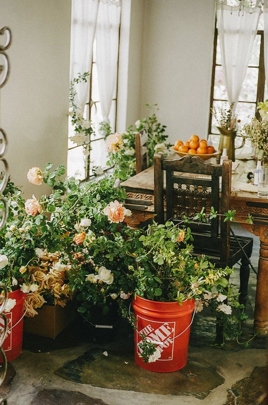 Fresh cut farm roses misted & hydrating in the bridal suite. The really tall, unruly ones with white flowers are called “whips”.