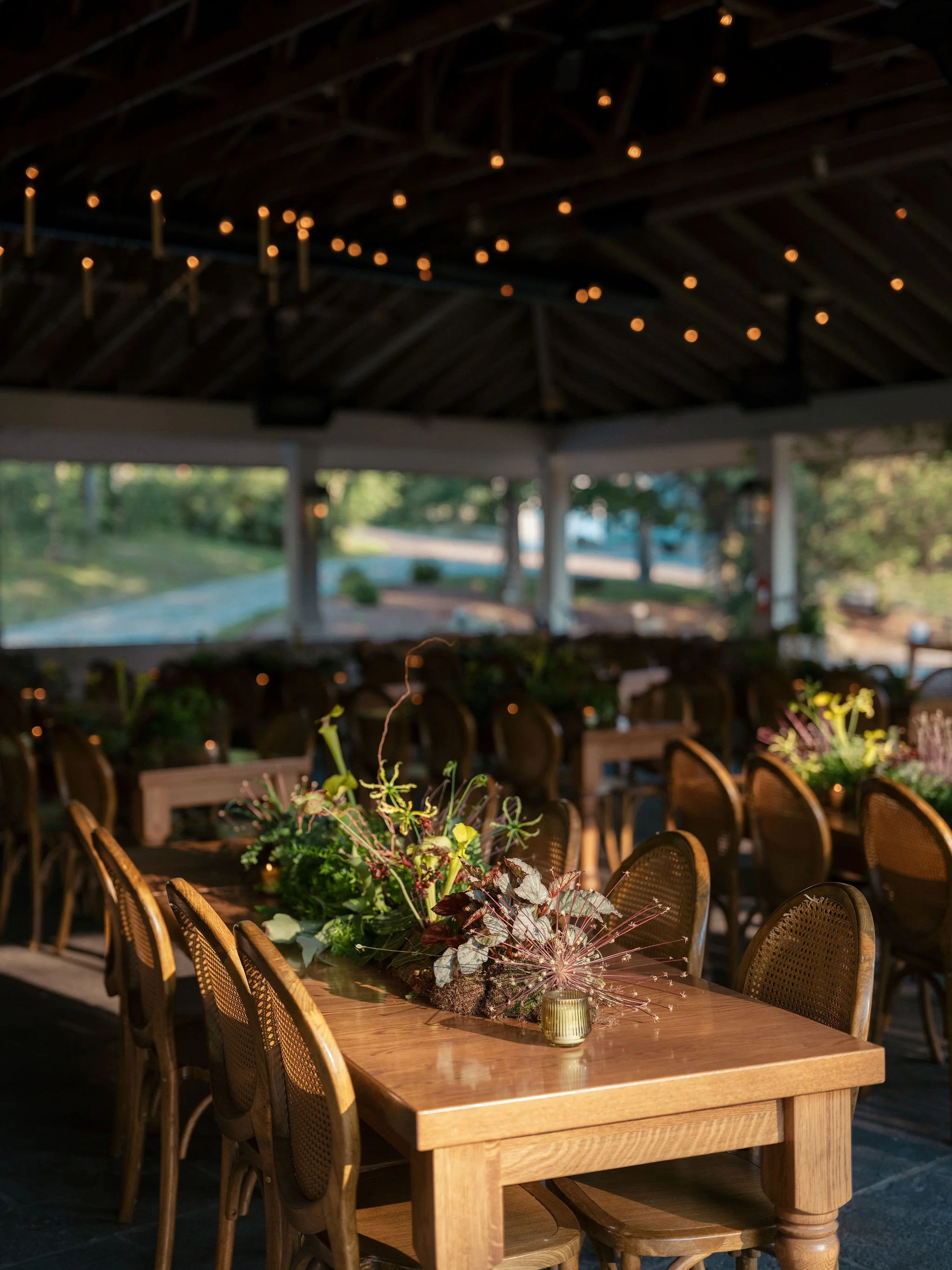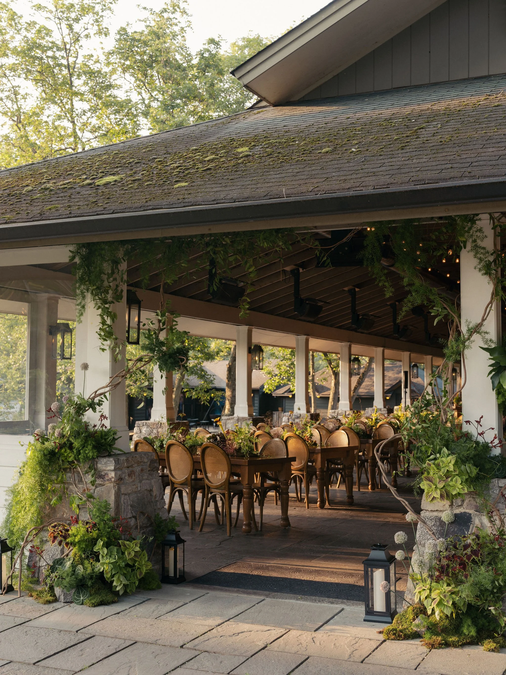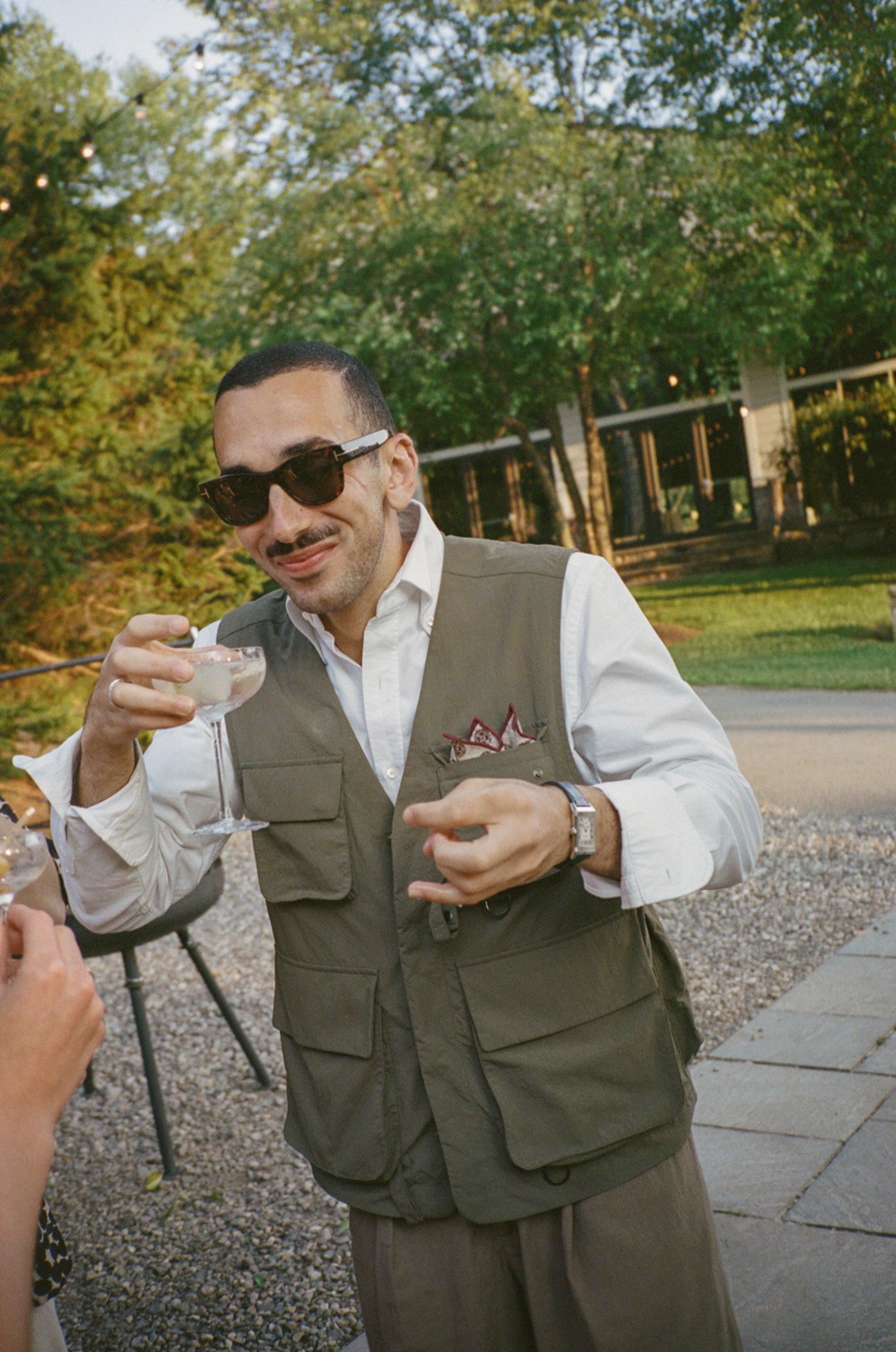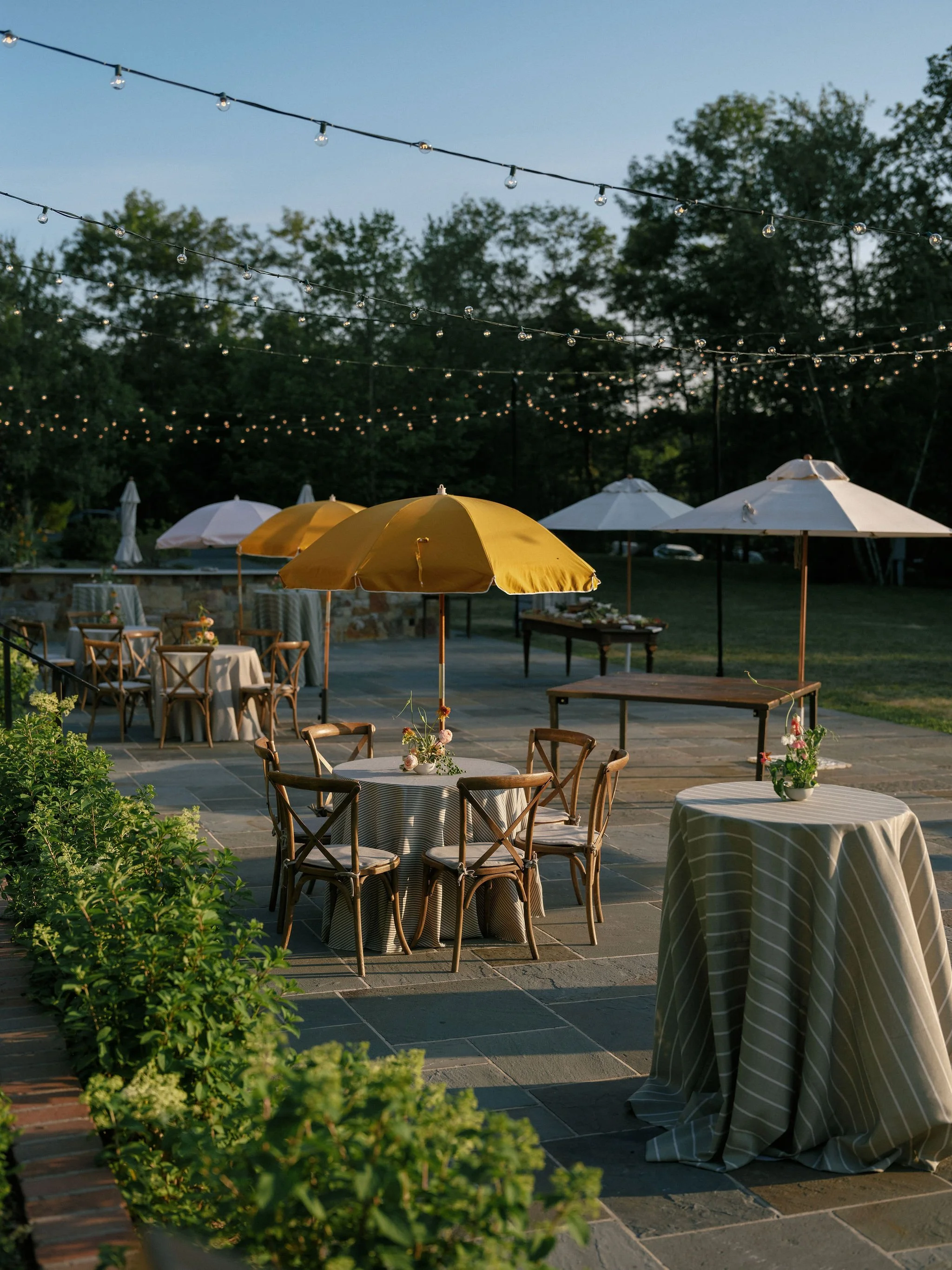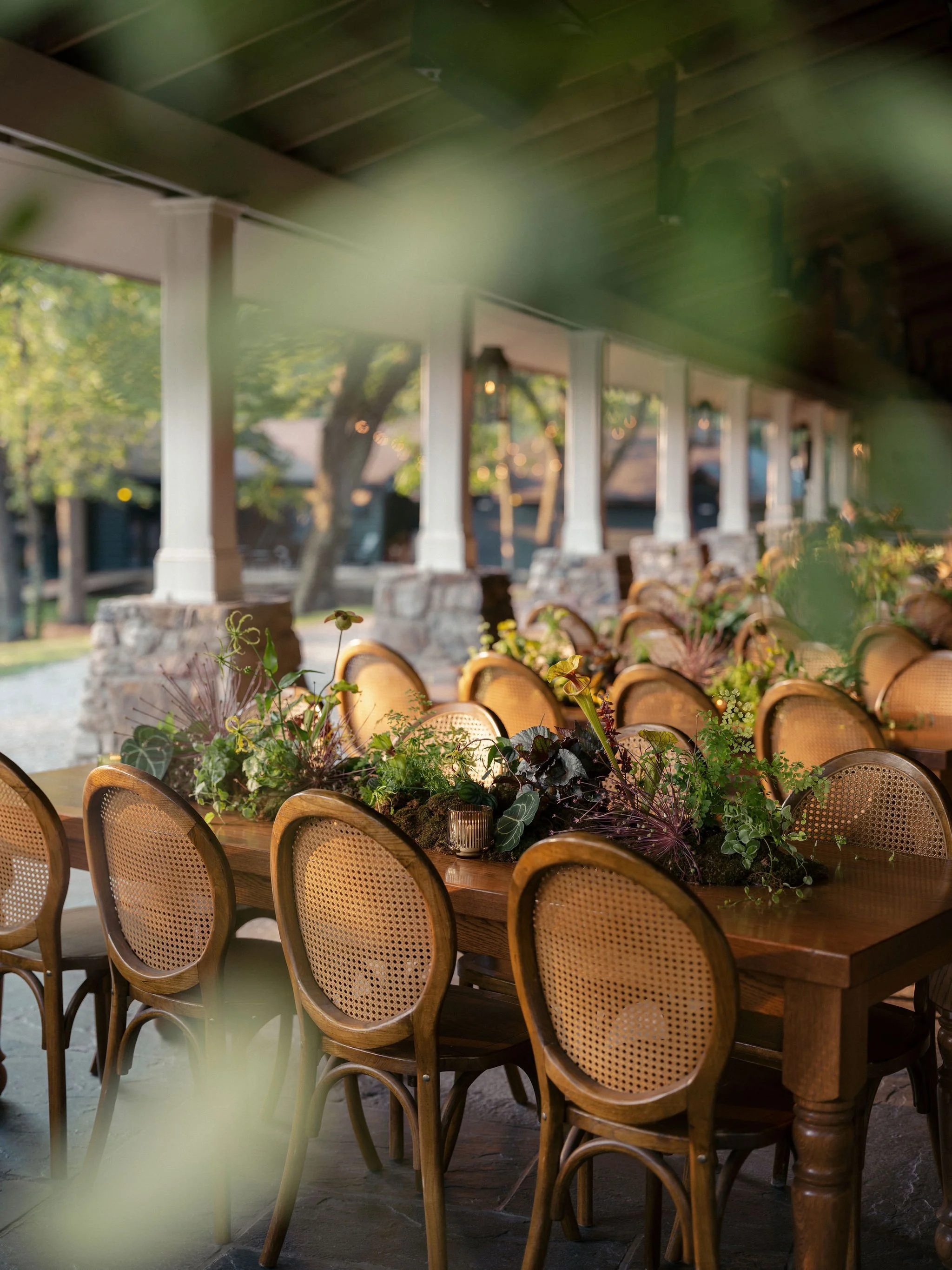 Tatum & Farouk’s welcome party fell on the Fourth of July, and they went all-in on the elevated camp vibe that is so quintessentially Cedar Lakes Estate. The design prompt we received from Nicole at Wander Event Design was — “90s Ralph Lauren meets safari, so lots of khaki, but in the chicest way you can imagine.” We talked about creating a jungle-like atmosphere without tropicals, the design inspired by the groom’s New Zealand roots, where temperate rainforests host plants like ferns and soft moss.