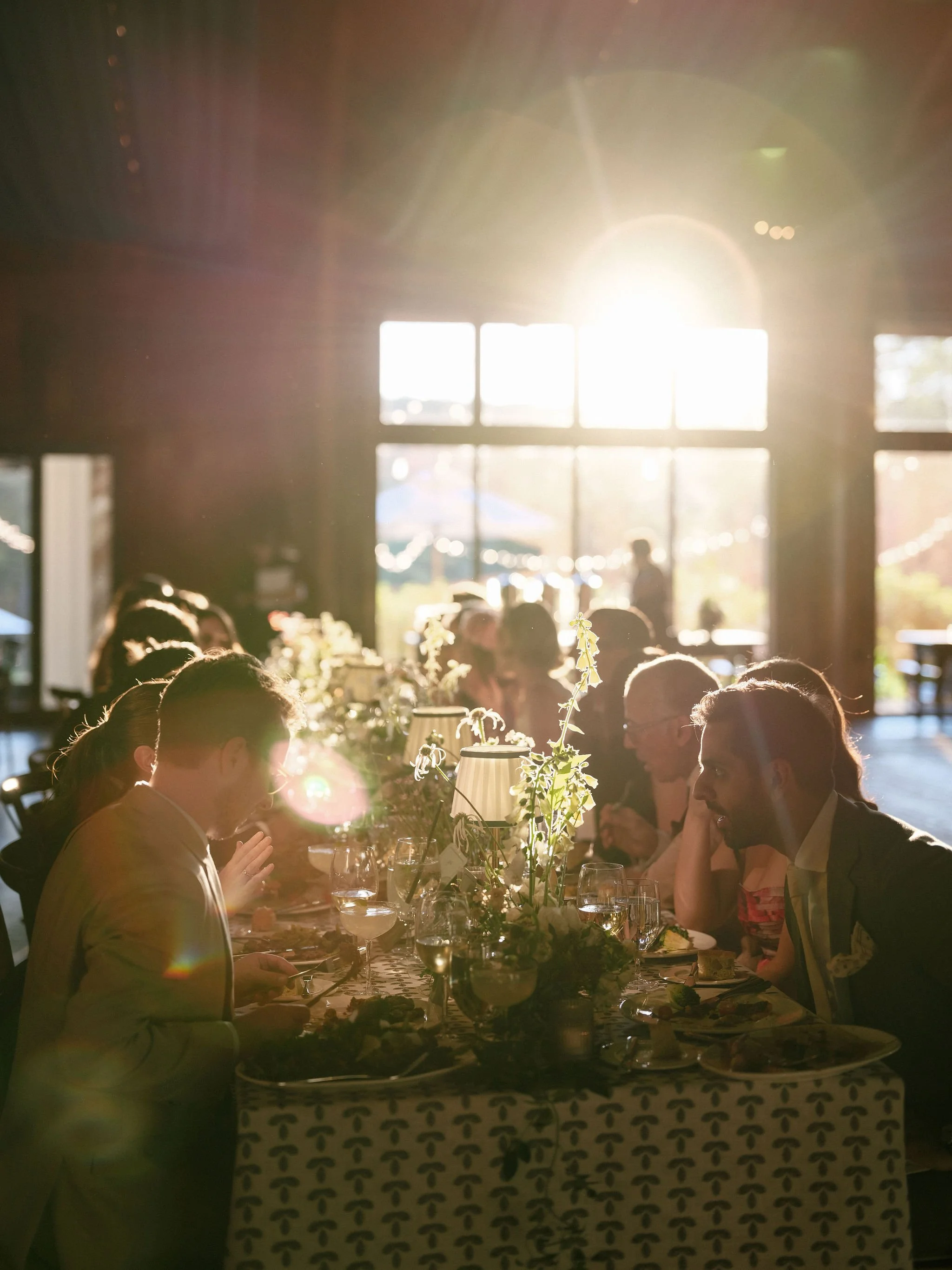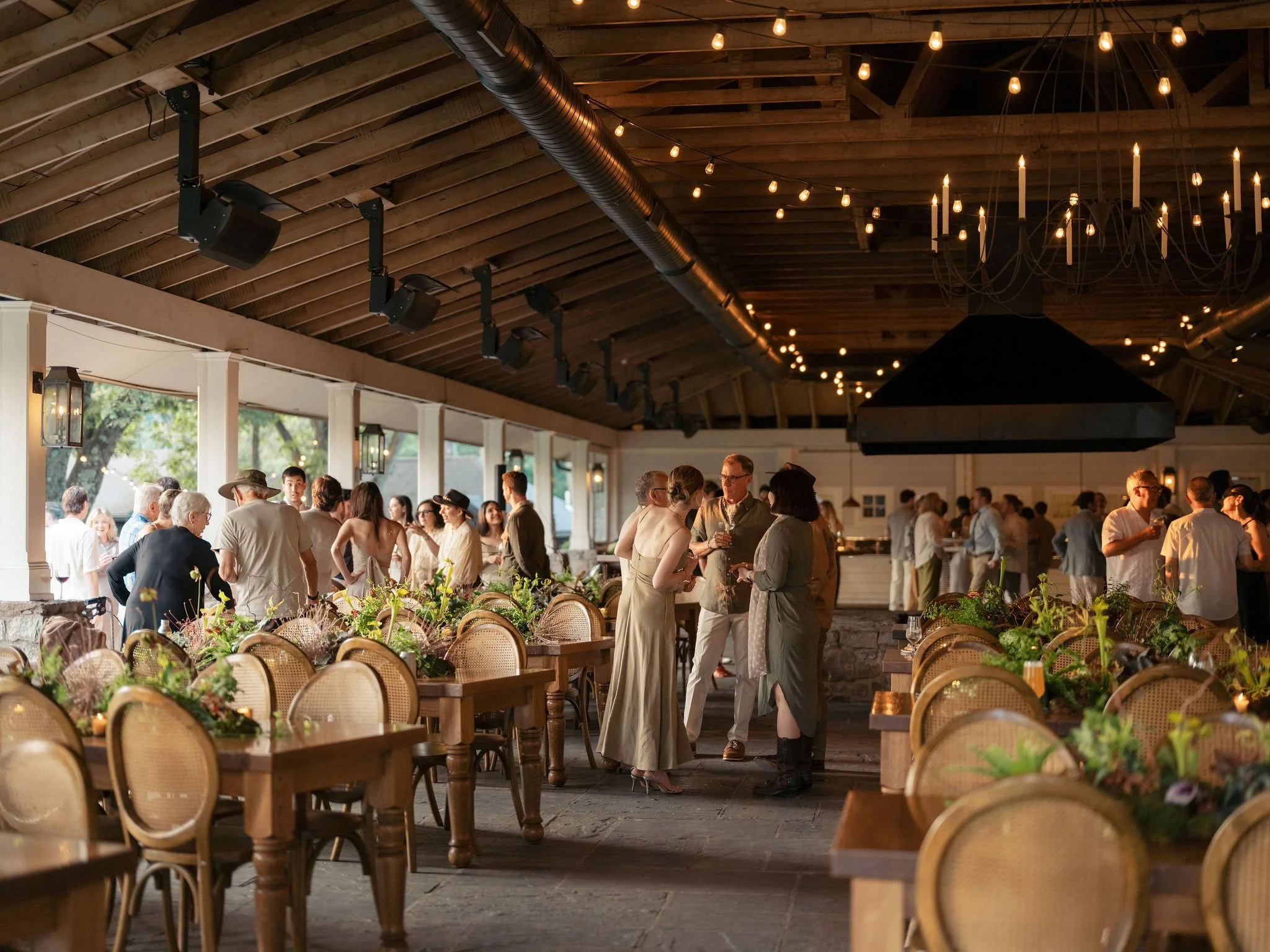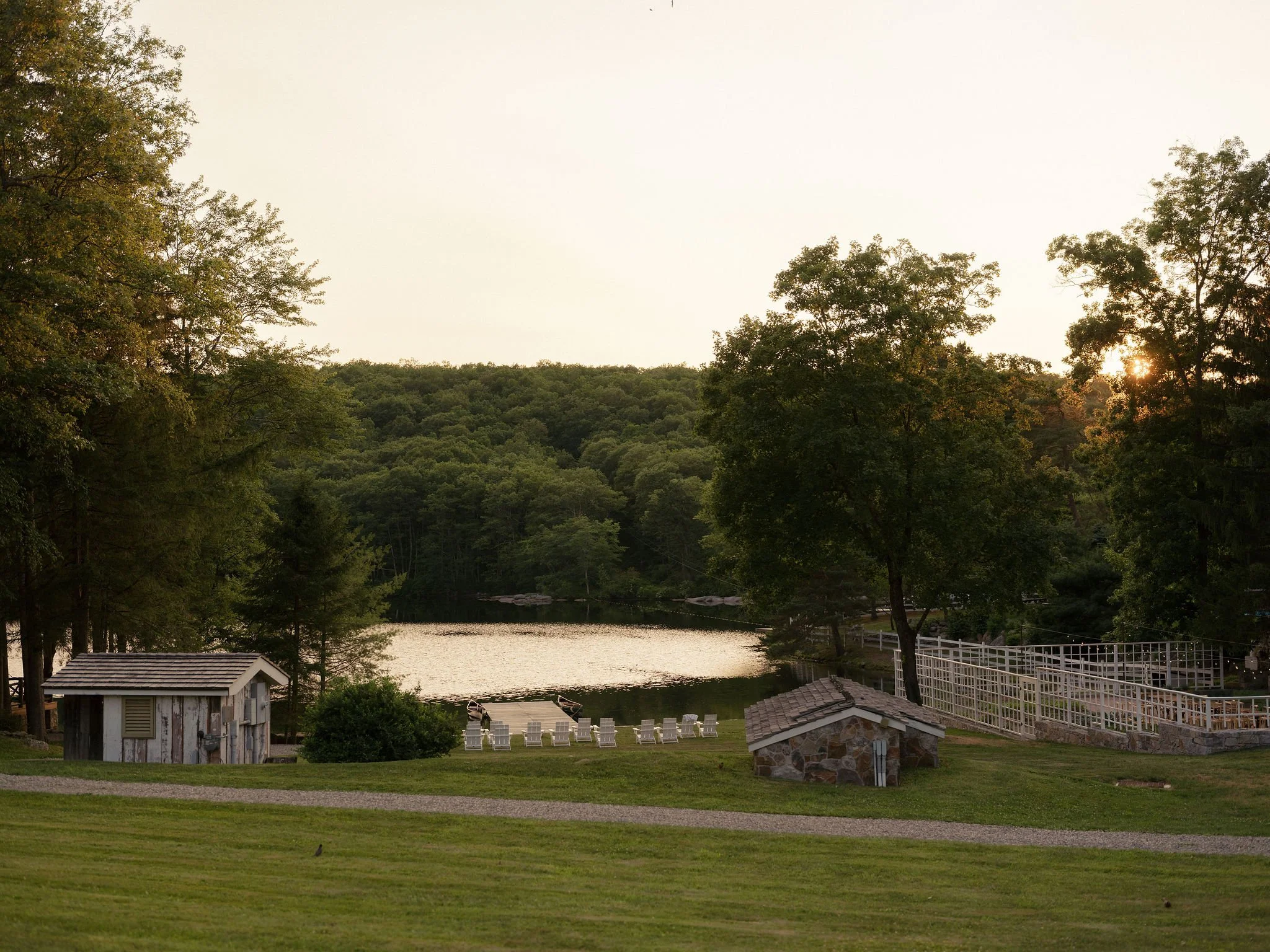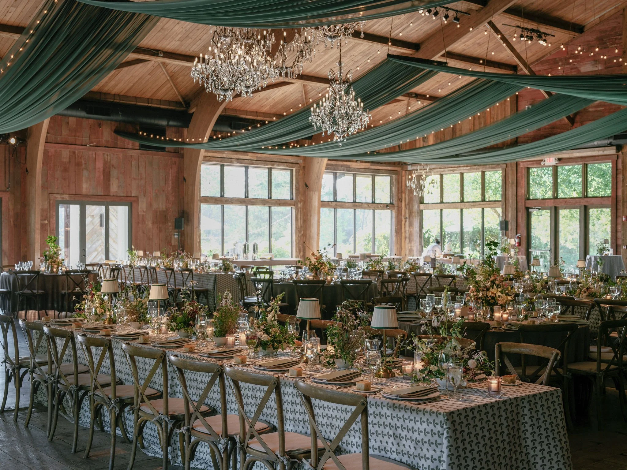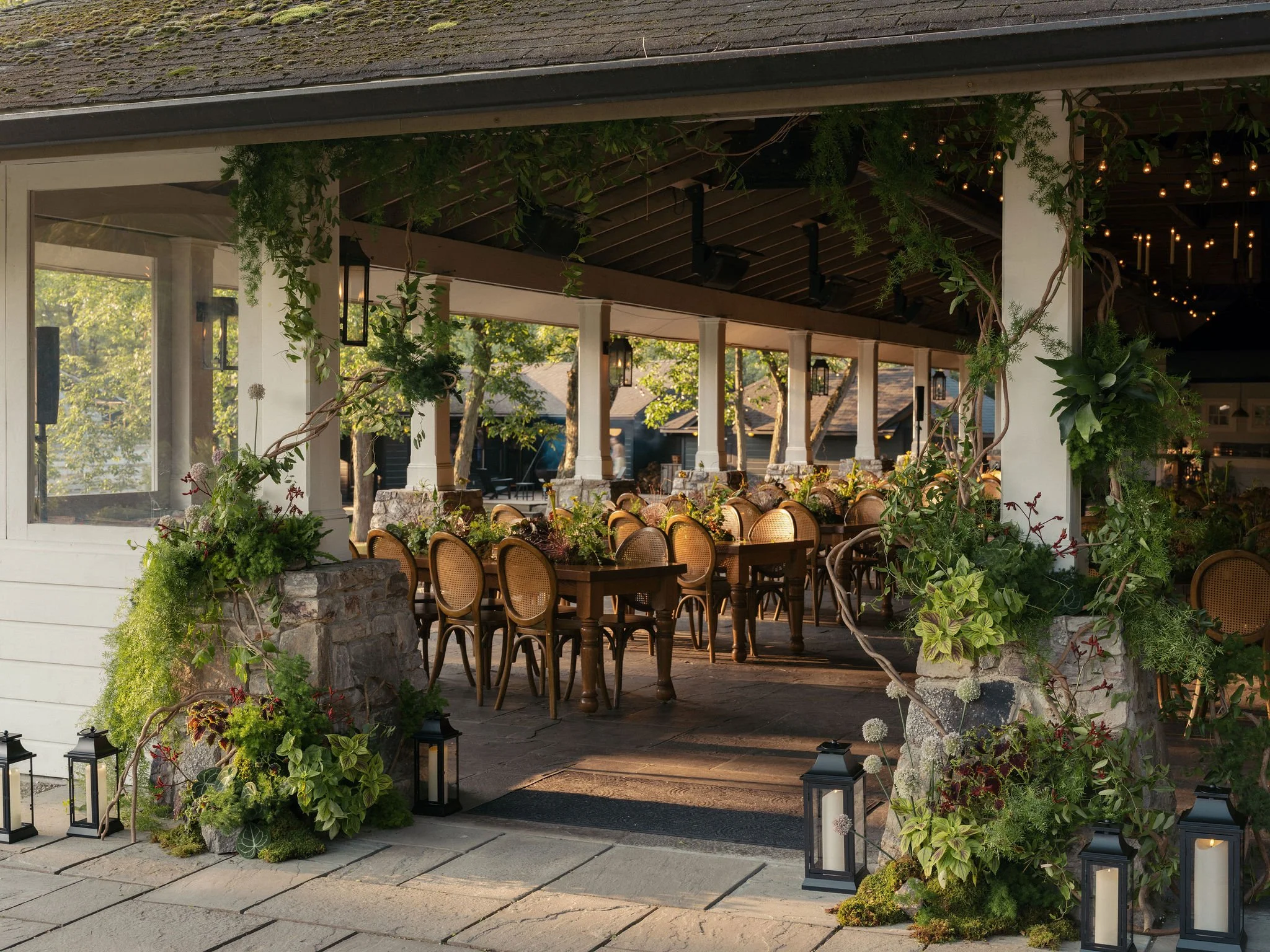 Tatum & Farouk’s welcome party fell on the Fourth of July, and they went all-in on the elevated camp vibe that is so quintessentially Cedar Lakes Estate. The design prompt we received from Nicole at Wander Event Design was — “90s Ralph Lauren meets safari, so lots of khaki, but in the chicest way you can imagine.” We talked about creating a jungle-like atmosphere without tropicals, the design inspired by the groom’s New Zealand roots, where temperate rainforests host plants like ferns and soft moss.