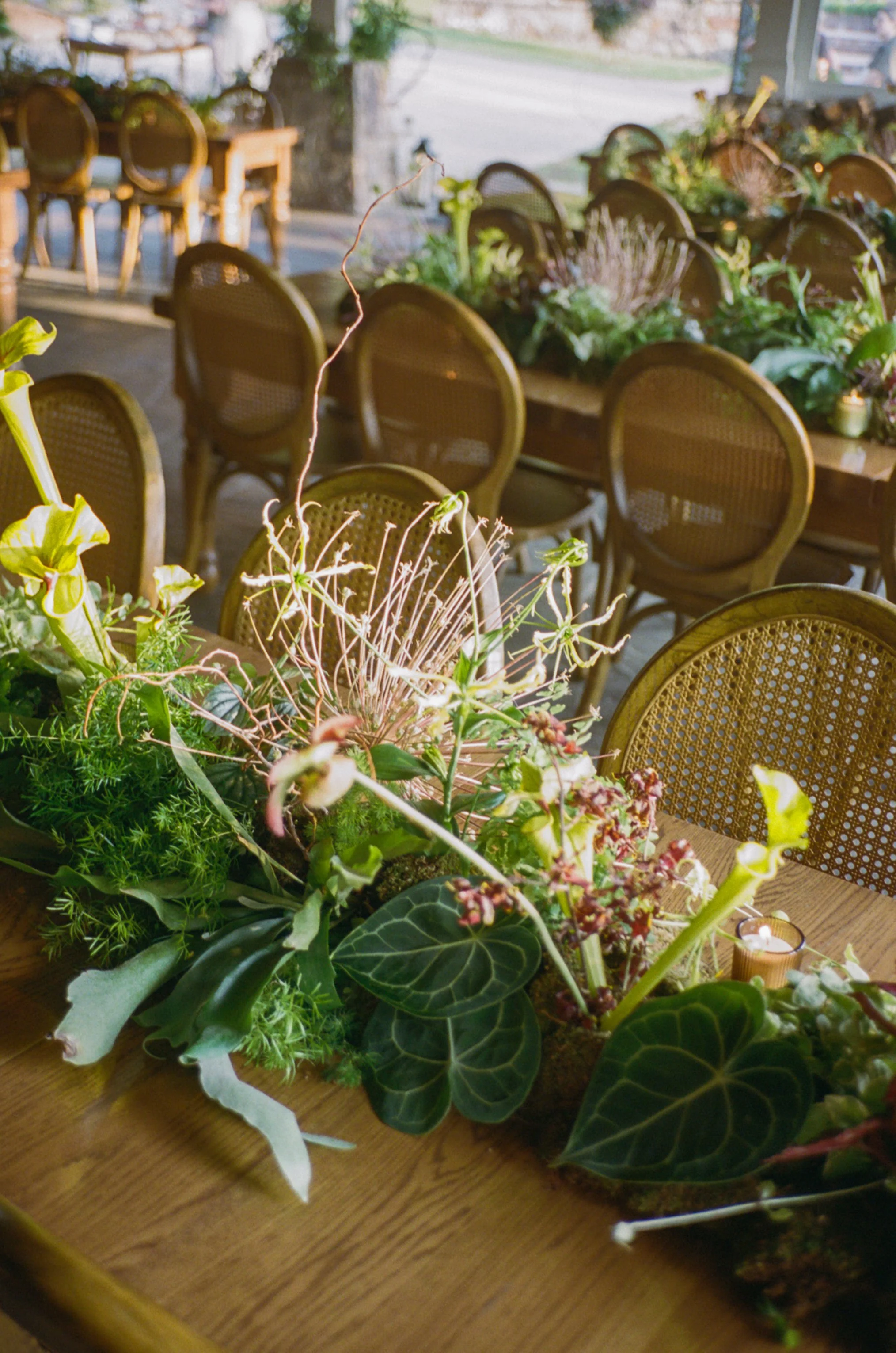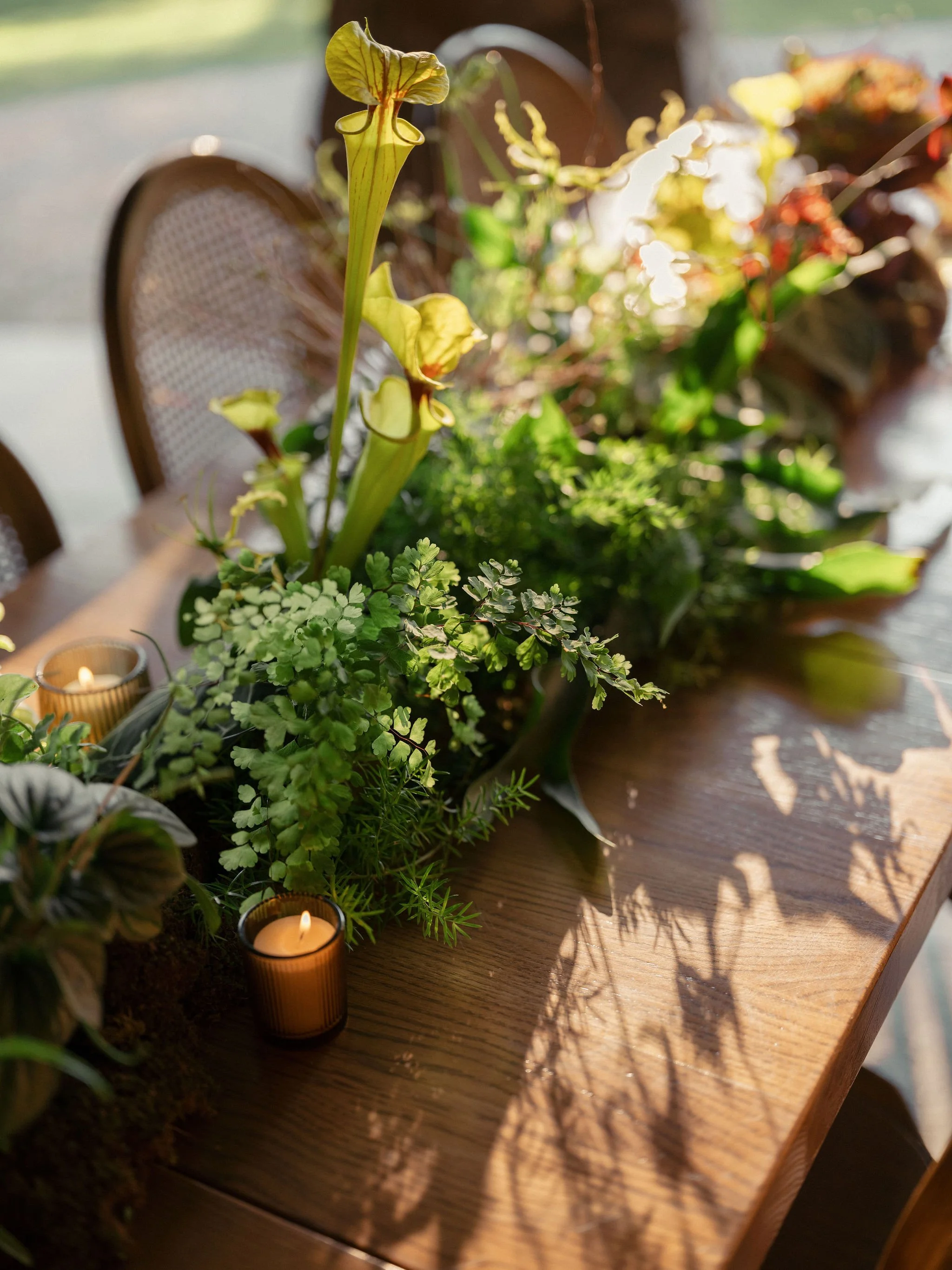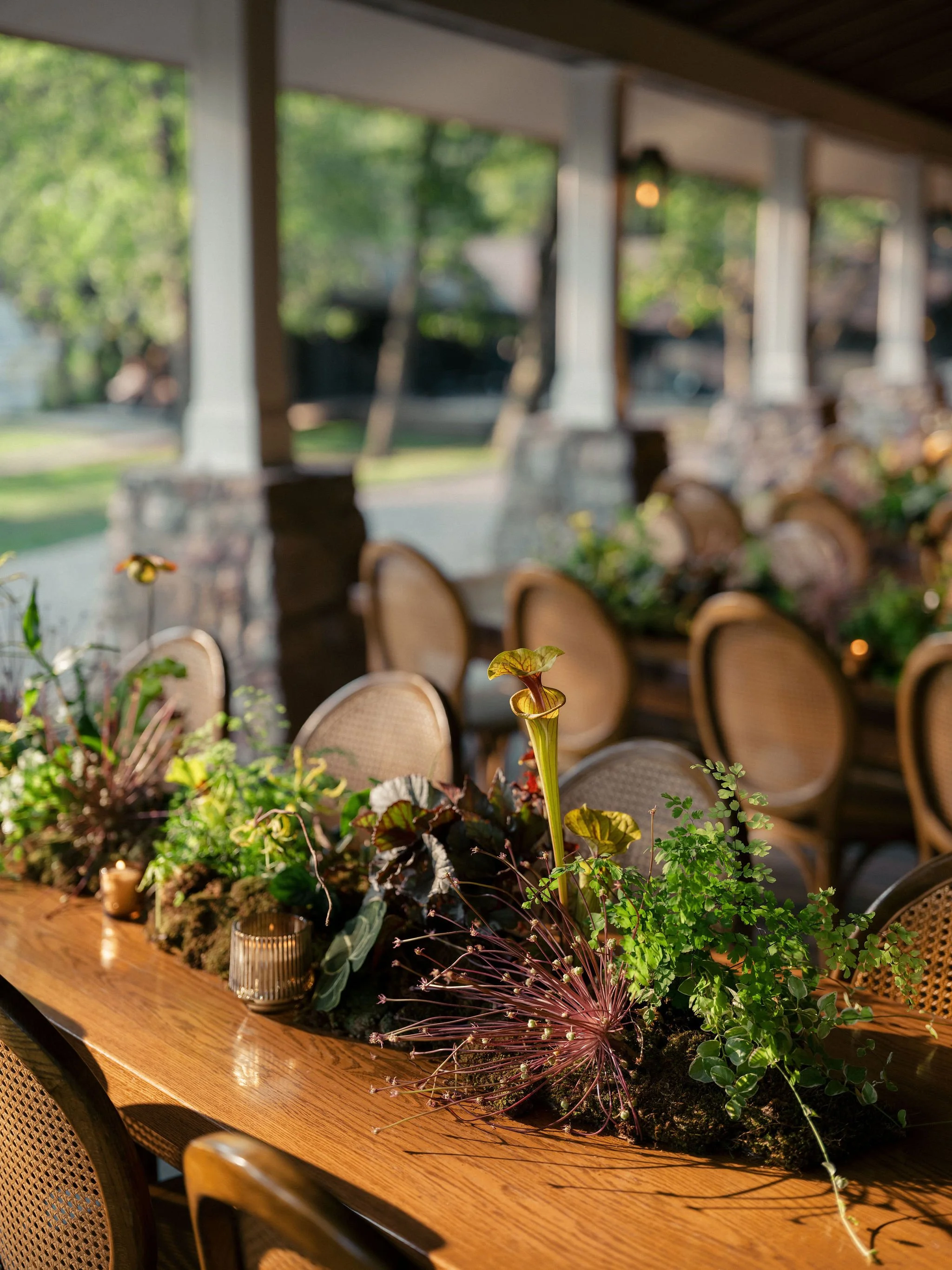 In order to eliminate waste, we created tablescapes that were 95% potted plants and moss, with only touches of hardy, on-theme flowers like gloriosa lillies, various sarracenia, and Schuberti alliums. This meant that these installations were enjoyed all weekend — we absolutely love it when our flowers can be repurposed so naturally. After the wedding, our partners at Groundcycle repotted every plant and partnered with a local coffee shop in Brooklyn to re-home them. Little pieces of T & F’s epic weekend live on in the homes of so many neighbors.