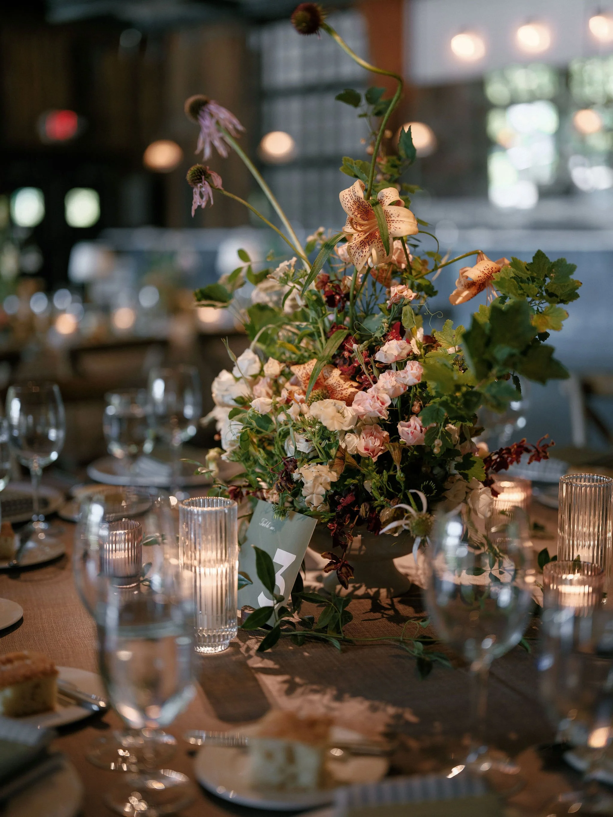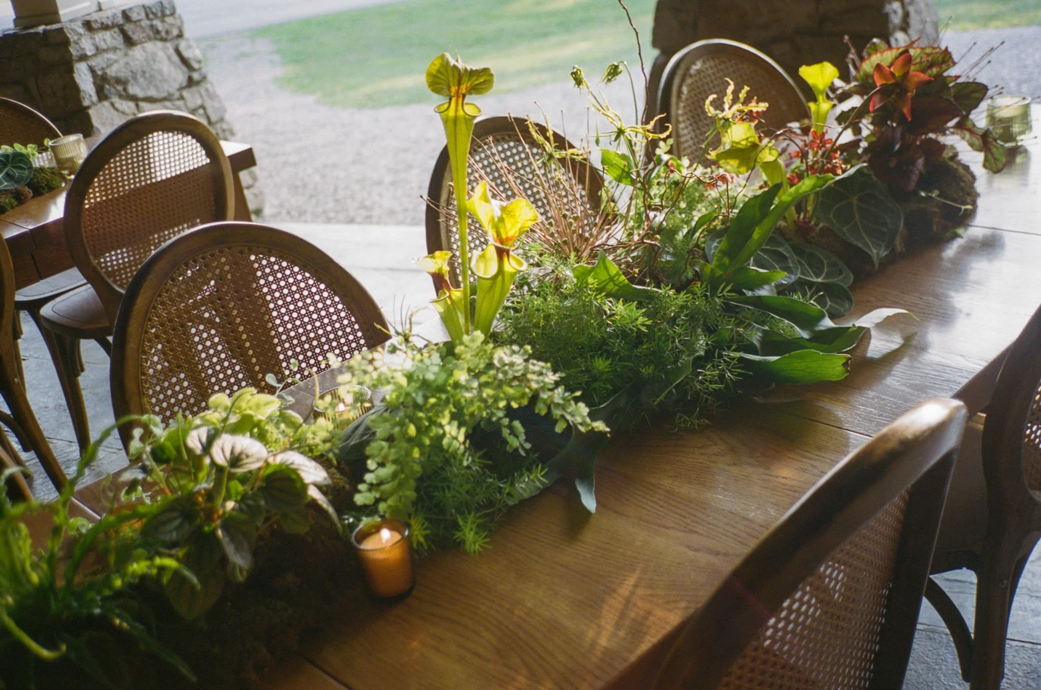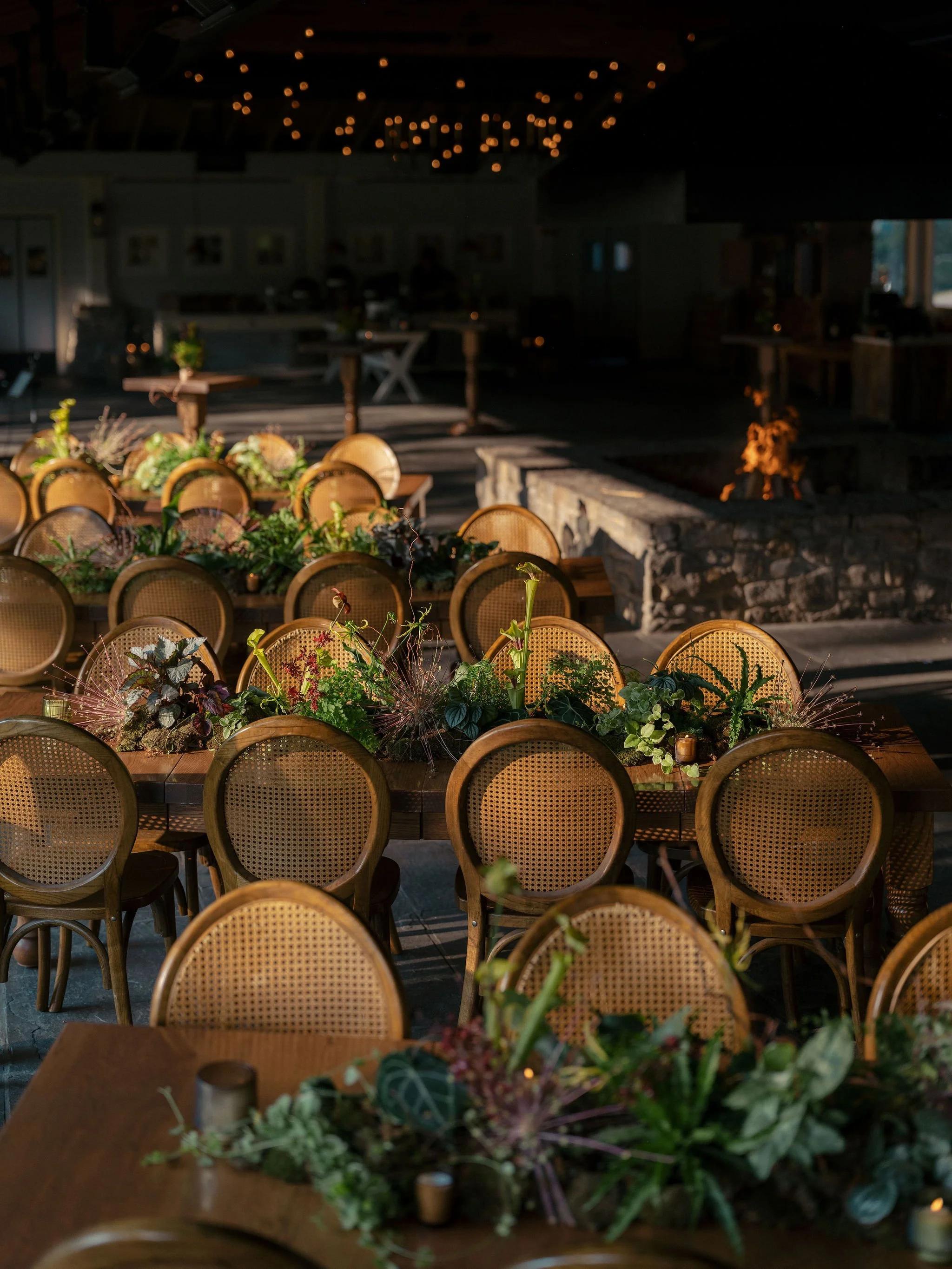 In order to eliminate waste, we created tablescapes that were 95% potted plants and moss, with only touches of hardy, on-theme flowers like gloriosa lillies, various sarracenia, and Schuberti alliums. This meant that these installations were enjoyed all weekend — we absolutely love it when our flowers can be repurposed so naturally. After the wedding, our partners at Groundcycle repotted every plant and partnered with a local coffee shop in Brooklyn to re-home them. Little pieces of T & F’s epic weekend live on in the homes of so many neighbors.