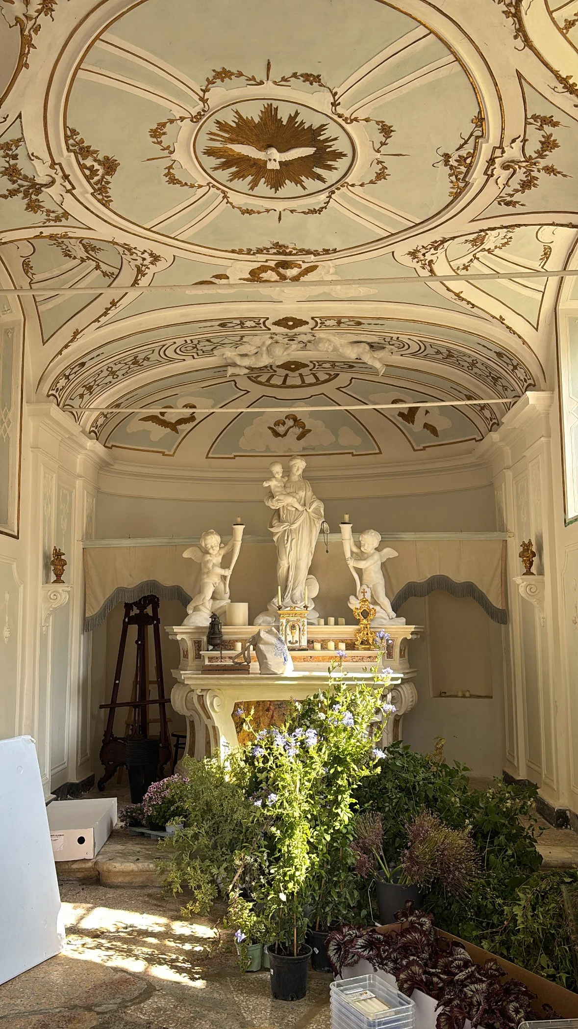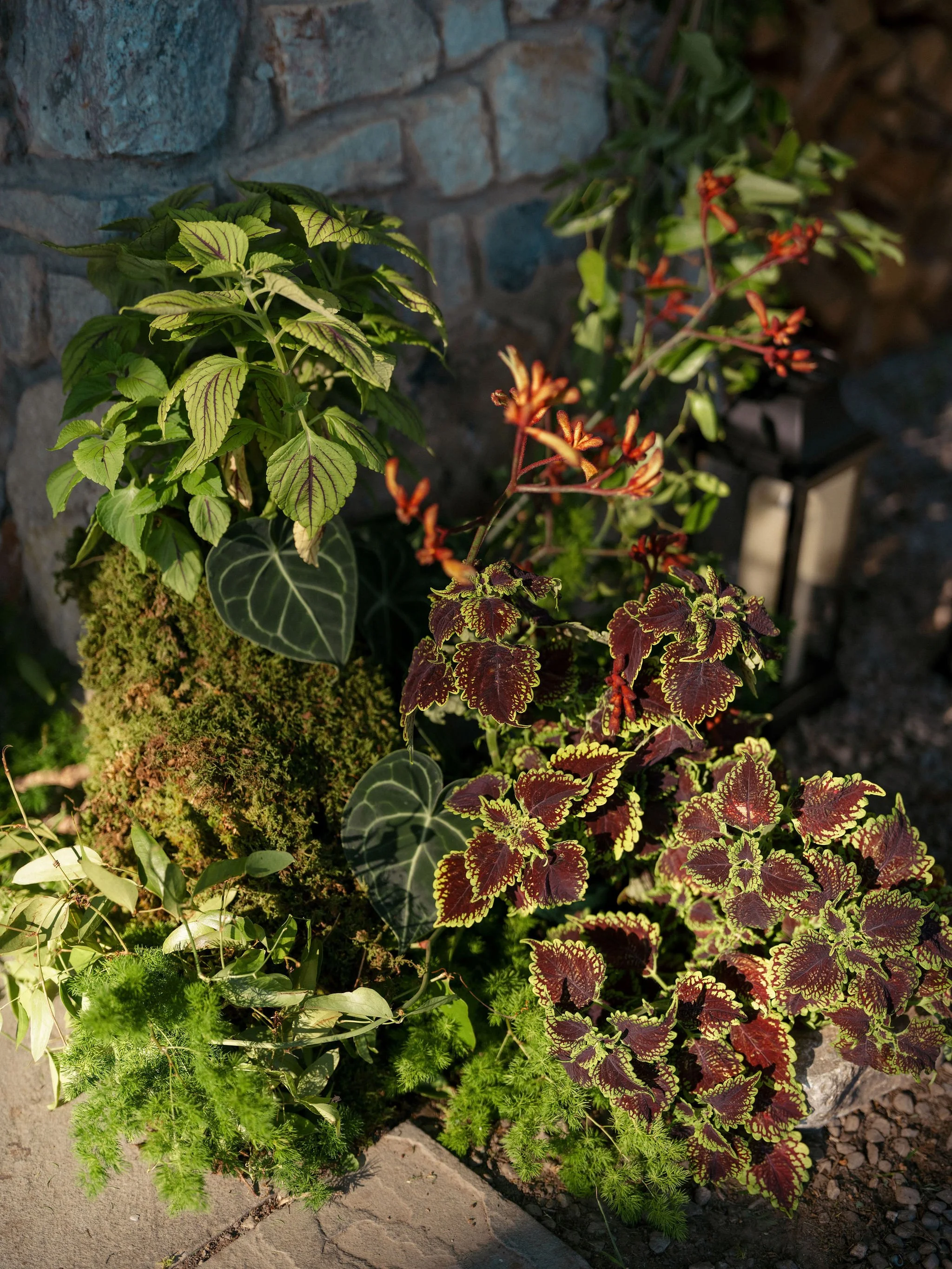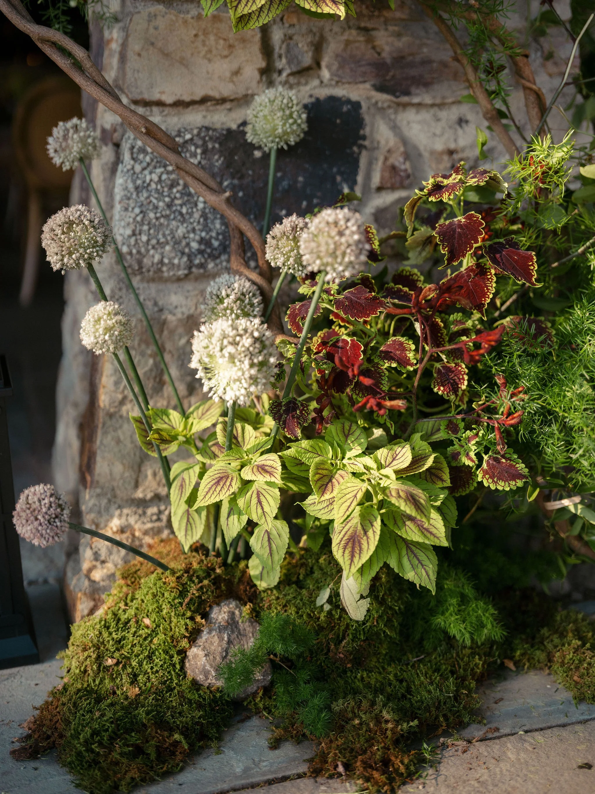 potted ferns, begonias, alliums, and pitcher plants